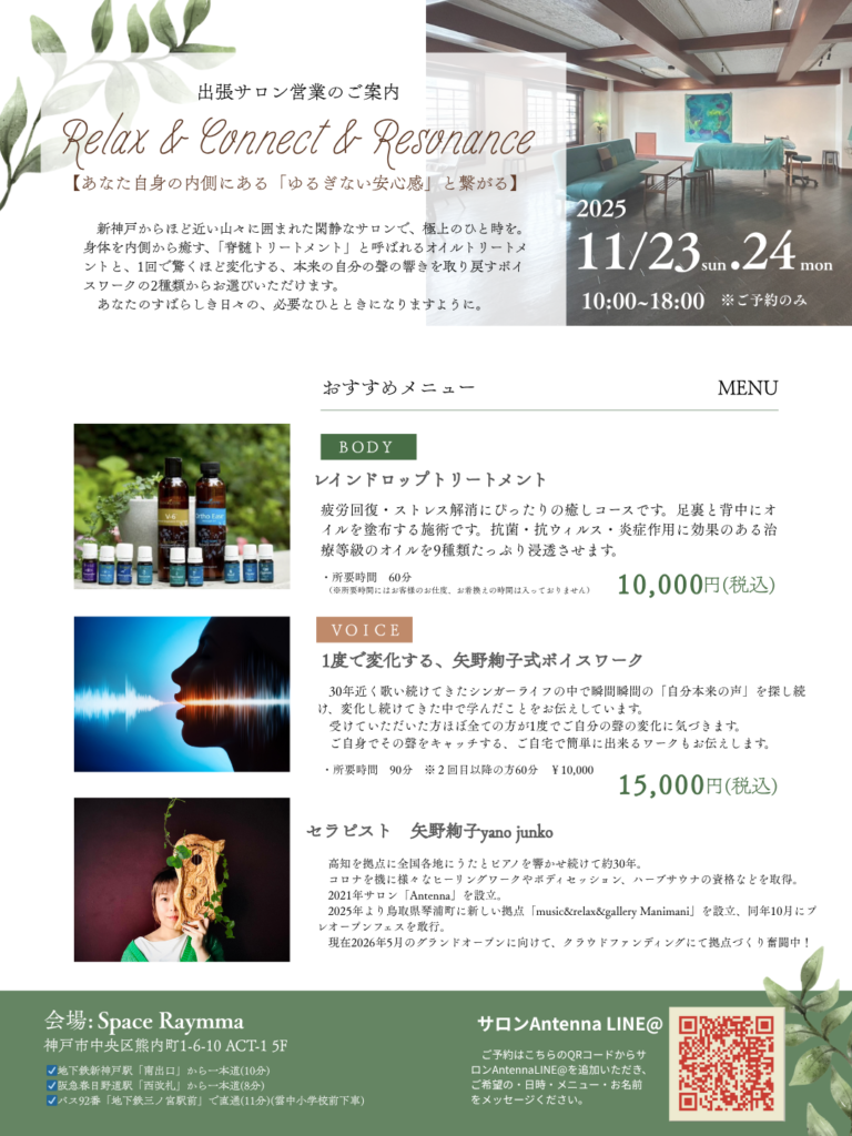 身体を内側から癒す、「脊髄トリートメント」と呼ばれるオイルトリートメントと、1回で驚くほど変化する、本来の自分の聲の響きを取り戻すボイスワークの2種類からお選びいただけます。